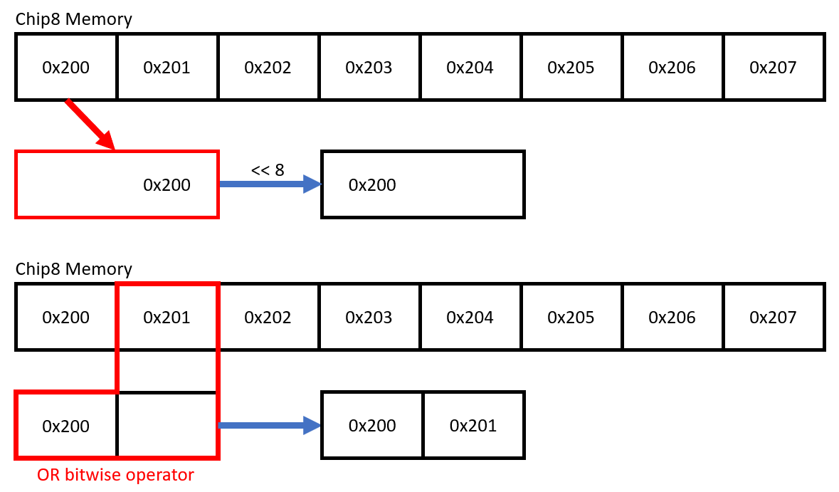 由於剛剛讀進來的ROM是從512(0x200)開始往下放,而每個Opcode都是2 bytes,所以先從memory讀1byte之後再將其往左推,與下一個byte做OR運算
