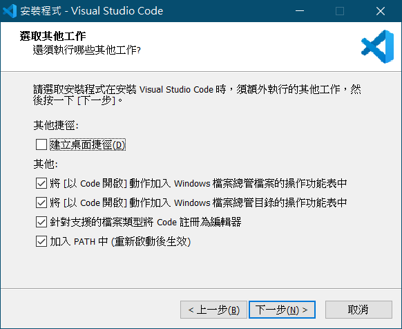 - 針對支援的檔案類型將Code註冊為編輯器 VSCode支援大部分的程式檔與設定檔,會針對各個不同的副檔名更換該檔案的圖示,建議勾選