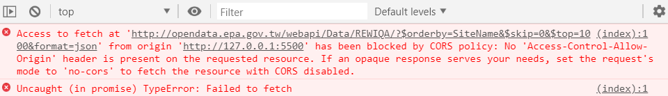 ,到了實際上要抓資料的時候,發現並沒有那麼容易,一開始是透過ES6內建的fetch()來抓資料,但跳出了這個訊息