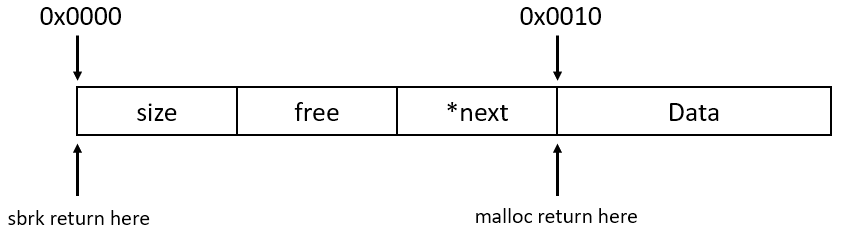 malloc分配記憶體的方法最簡單就是這樣,但分配完之後還需要管理,在這裡是透過Linked-List的方式來做記憶體管理,每次分配記憶時額外加上一段header,讓我們能夠到這段分配的記憶體大小以及是否已經被釋放等等資訊,結構如下。
